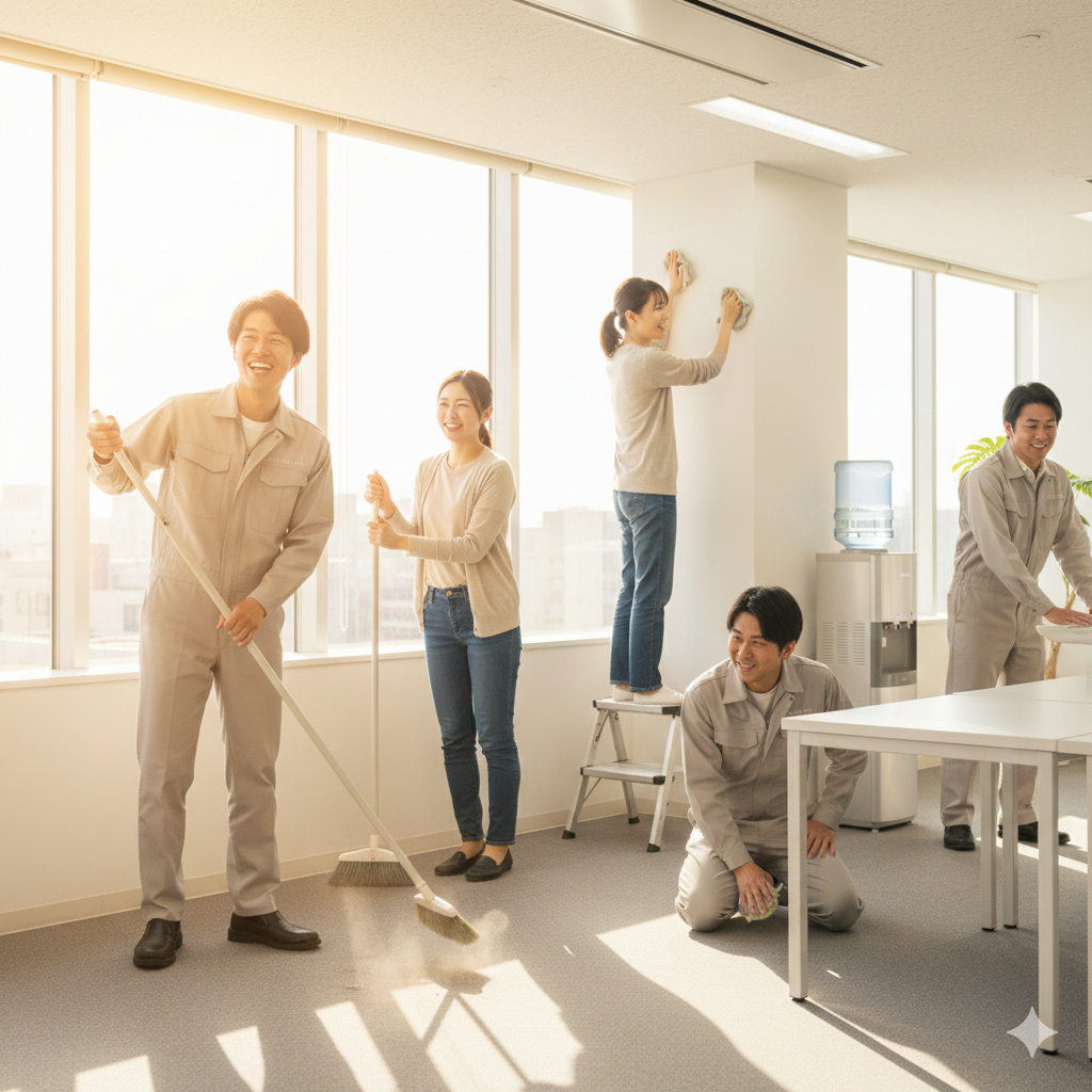 朝8時からの全員掃除: 仕事の前に体を動かし、頭をリフレッシュ。環境を整えることで、仕事への集中力を高めます。