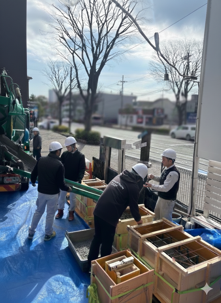 今回は、現場でコンクリートを流すのではなく、あらかじめ自社ヤードで基礎を作成する「プレキャスト方式」を採用しました。