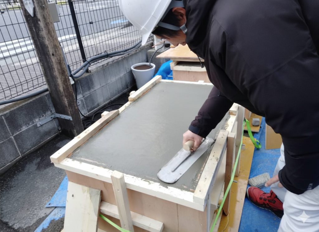 ただ流し込むだけではありません。 コンクリートの中に空気が残らないよう丁寧に振動を与え、表面をコテで美しく仕上げていきます。